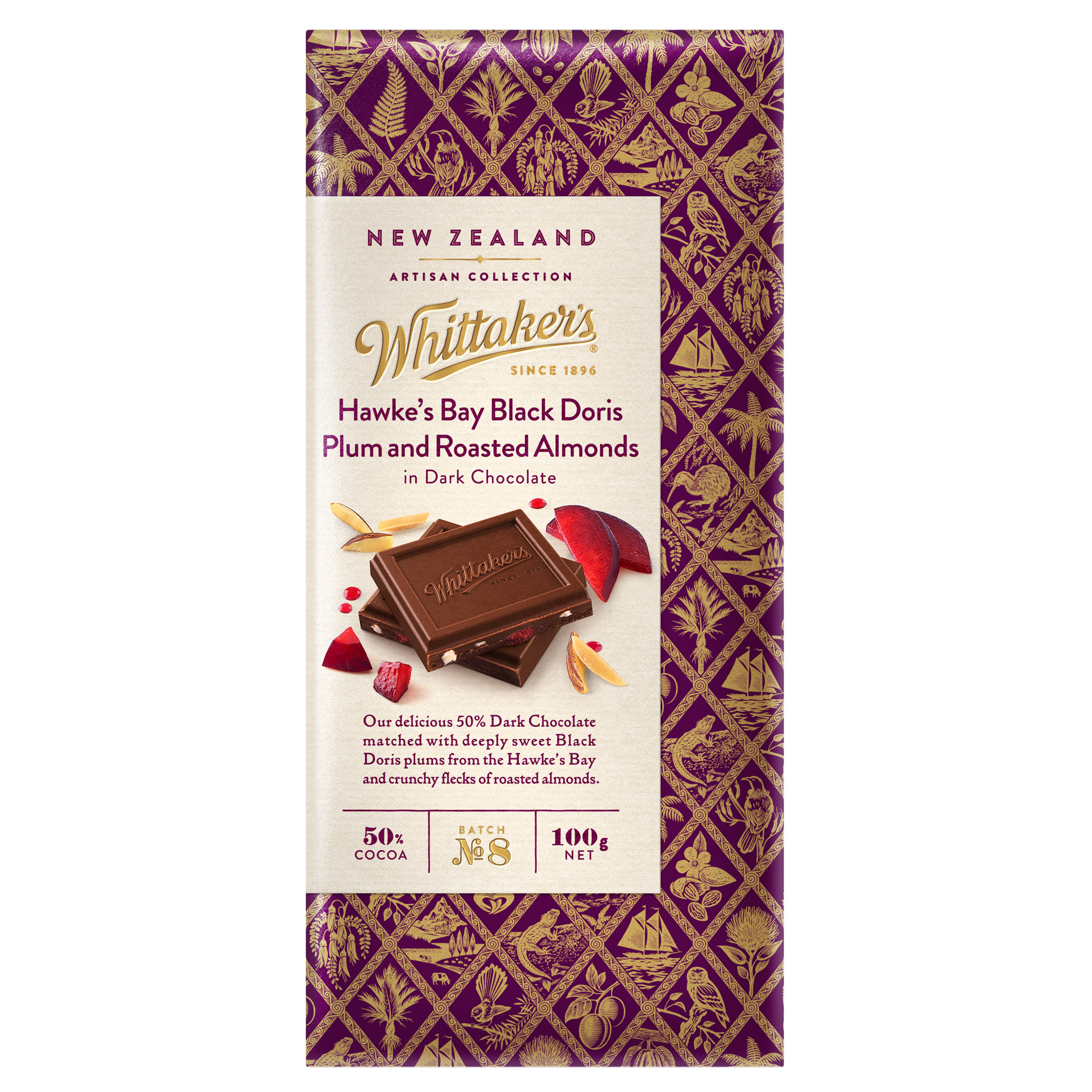 Dark Chocolate [Cocoa Solids 50% * (Cocoa Mass & Cocoa Butter); Sugar; Emulsifier (Soya Lecithin); Plum Flavour; Vanilla Flavour]. Roasted Almonds 5% ; Freeze Dried Plum Pieces 1.5% *Minimum percentage.