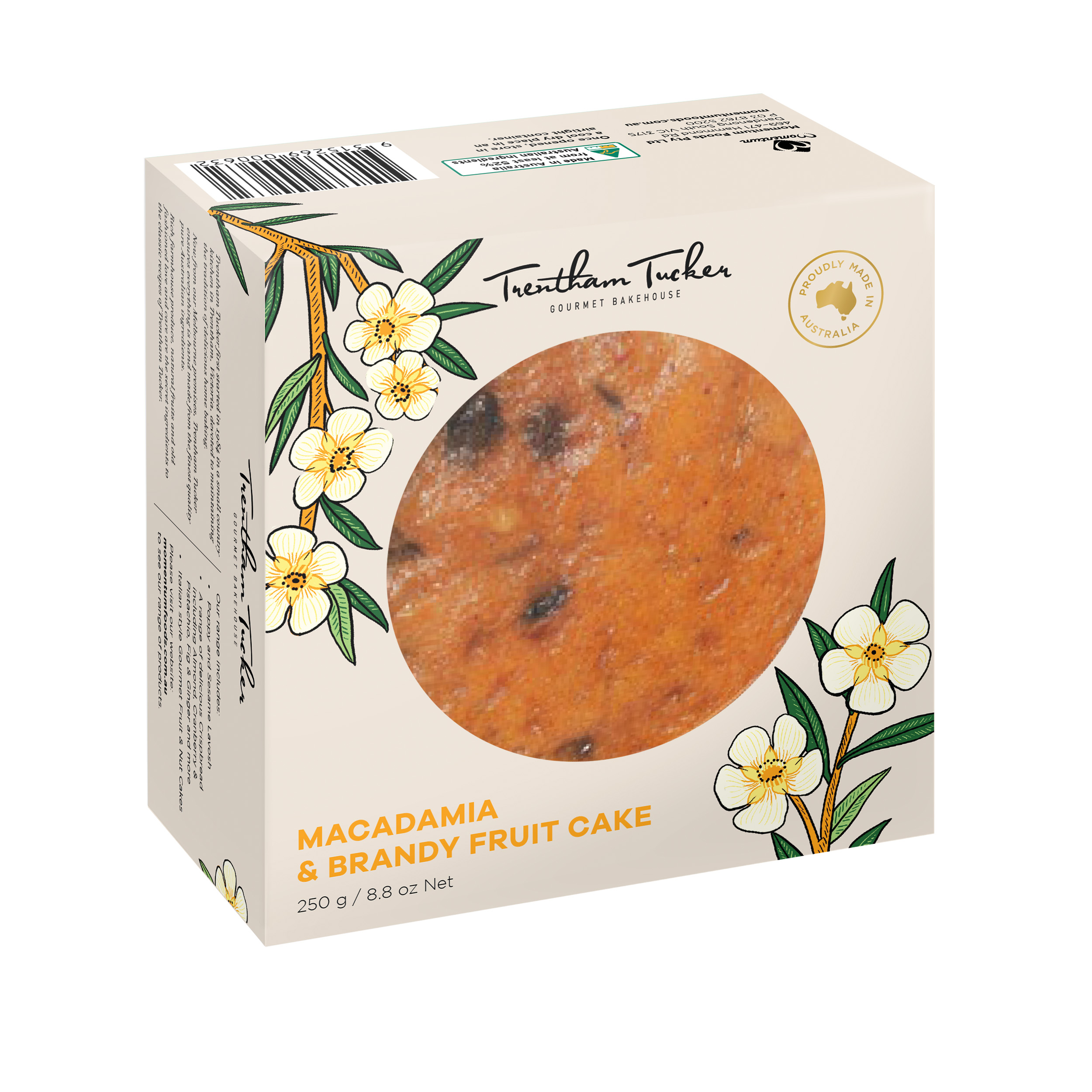 Mixed Fruits (36%) [Sulltanas, Pineapple, Raisins, Citrus Peel, ], Wheat Flour [Vitamins (Thiamin, Folic Acid)], Sugar, Egg, Water, Vegetable Fat [Sustainabley Sourced Palm Oil, Canola Oil, Emulsifier (332, Soy), Macadamia Nuta (3%), Corn Starch, Baking Powder, Milk Solids, Brandy (0.5%), Wheat Starch, Spice, Salt, Flavours, Preservative (202,220), Acidity Regulator (330,541).