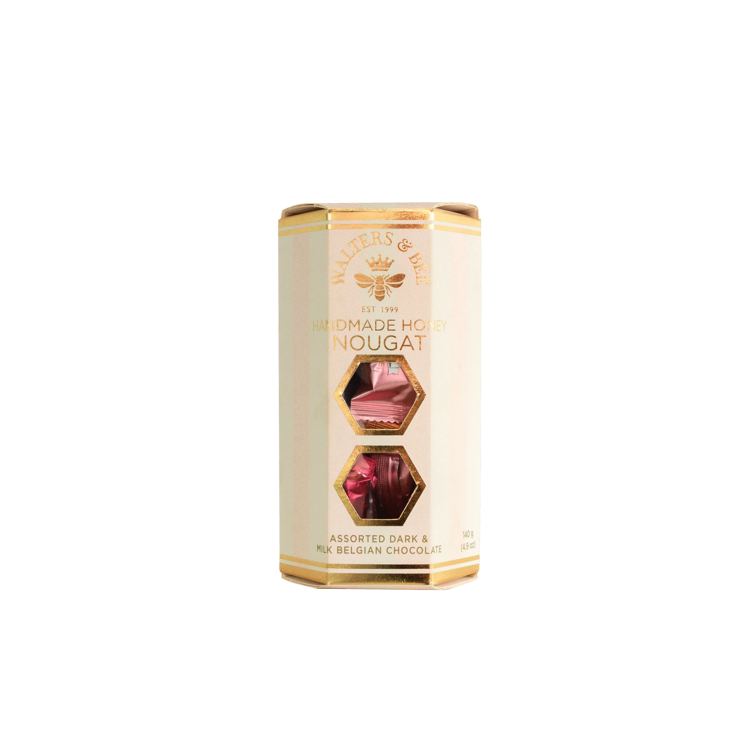 Milk Choc Almond: Nougat 62% [glucose syrup, sugar, almonds (23%), honey (11%), egg white, wafer paper (potato starch, water, vegetable oil (sunflower seed)), vanilla flavouring, salt] Milk Chocolate 38% [sugar, milk powder, cocoa butter, cocoa mass, emulsifier (soy lecithin), vanilla flavouring]. Chocolate contains cocoa solids 35% minimum, milk solids 20% minimum. Contains almond, egg, soy, milk. May be present: macadamias, hazelnuts, cashews, peanut and sesame. Milk Choc Macadamia: Nougat 62% [glucose syrup, sugar, macadamias (23%), honey (11%), egg white, wafer paper (potato starch, water, vegetable oil (sunflower seed)), vanilla flavouring, salt] Milk Chocolate 38% [sugar, milk powder, cocoa butter, cocoa mass, emulsifier (soy lecithin), vanilla flavouring]. Chocolate contains cocoa solids 35% minimum, milk solids 20% minimum. Contains macadamia, egg, soy, milk. May be present: almonds, hazelnuts, cashews, peanut and sesame. Dark Choc Cranberry: Nougat 62% [glucose syrup, sugar, dried cranberries (cranberries, sugar, vegetable oil (sunflower seed)) (18%), honey (11%), egg white, wafer paper (potato starch, water, vegetable oil (sunflower seed)), vanilla flavouring, salt] Dark Chocolate 38% [cocoa mass, sugar, cocoa butter, emulsifier (soy lecithin), vanilla flavouring]. Chocolate contains cocoa solids 55% minimum. Contains egg, soy. May be present: almond, macadamia, hazelnut, cashew, peanut and sesame. Dark Choc Strawberry: Nougat 62% [glucose syrup, sugar, honey (11%), egg white, strawberry fruit cubes (8%)(apple pulp, apple juice concentrate, strawberry puree (11%), free flowing agent {cellulose}, gelling agent {pectin}, black carrot juice concentrate, strawberry flavouring, acidity regulator {citric acid}) (18%), honey (11%), wafer paper (potato starch, water, vegetable oil (sunflower seed)), vanilla flavouring, salt] Dark Chocolate 38% [cocoa mass, sugar, cocoa butter, emulsifier (soy lecithin), vanilla flavouring]. Chocolate contains cocoa solids 55% minimum. Contains egg, soy. May be present: almond, macadamia, hazelnut, cashew, peanut and sesame.